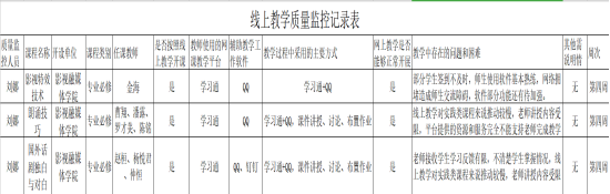 学院结合实际制订了全院线上教学质量监控记录表,通过每次课后督导组成员与授课老师之间的沟通,每周将其问题反馈到记录表中,以便及时改进和优化。