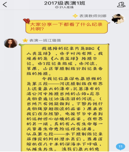 同学们通过电脑、平板和手机等终端平台,学习线上课程,阅读拓展知识,同专业教师研讨问题、回答疑问,线上课程氛围浓厚且具有生动性。2018级广播电视编导同学留言“线上课程学习灵活、方便,又高效。可以阅读大量补充的知识,还可以反复学习加深理解,具有很多优势“。