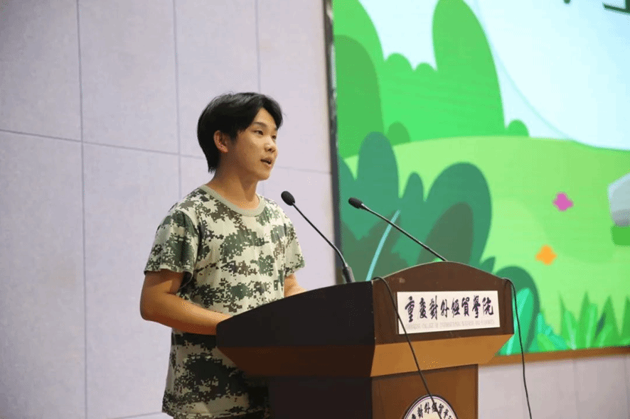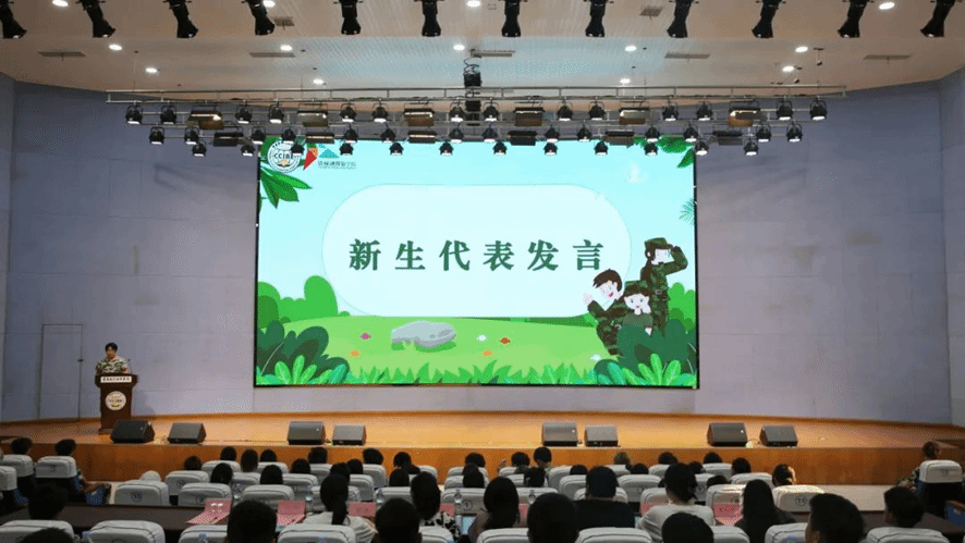 紧接着是新生代表孙彬发言。他对领导、教官和辅导员的辛勤付出表示了衷心的感谢,同时也赞扬了教官们的严格训练和人文关怀,辅导员的默默支持,以及同学们的顽强拼搏。孙彬同学鼓励同学们将军训中学到的纪律和团队精神应用到未来的学习和生活中,以实现个人成长和学院的共同进步。他期待大家以军训为起点,迎接挑战,创造美好明天。