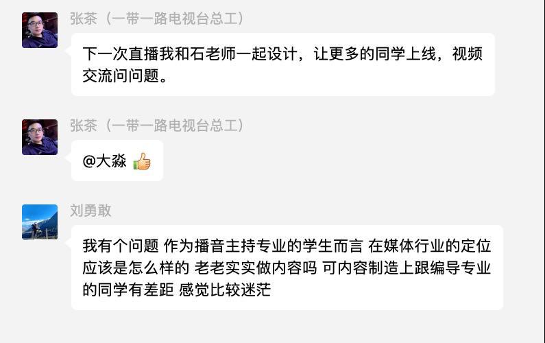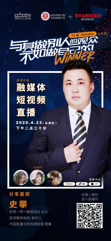 本期邀请的行业导师是世界一带一路电视台台长史攀先生,史攀先生在媒体行业深度耕耘十余年,在本次线上教学讲座上,史攀老师主要针对形势,引导同学了解和认识新媒体、直播以及短视频的形成和发展的历程,在论述的发展过程中史攀老师与同学们积极互动,穿插回答着同学们的提问,并结合生活中的例子生动形象地讲授着自己的专业观点,如阐述融媒体的发展,PGC到UGC的转变,直播与技术、社会发展的关系、直播与电商的相互作用、短视频的传播发展和运营模式,还有同学提到的关于直播、短视频以及今后专业发展的方向等等。