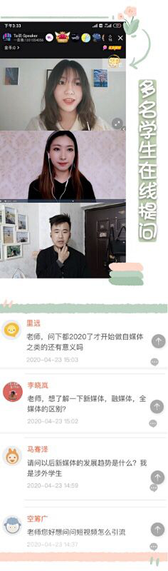 抗疫宅在家,学习不打烊,足不出户涨知识,行业导师来帮忙!在这个因疫情而延长开学时间的假期学习中,公海gh555000aa线路检测应时而发,为充分发挥共建产业学院的优势,深化互联网+教育的线上教学模式,让同学们始终保持良好的学习状态,针对媒体快速发展的实际,引导员工充分了解媒体业态发展,了解融媒体、短视频、直播等知识, 4月23日下午14:30,学院开展了主题为“与其做别人的观众,不如做自己的Winner——融媒体、短视频、直播”的线上教学讲座和互动,分享自己在媒体行业学习和工作的经验。课程也通过公司的媒体矩阵:抖音、快手。