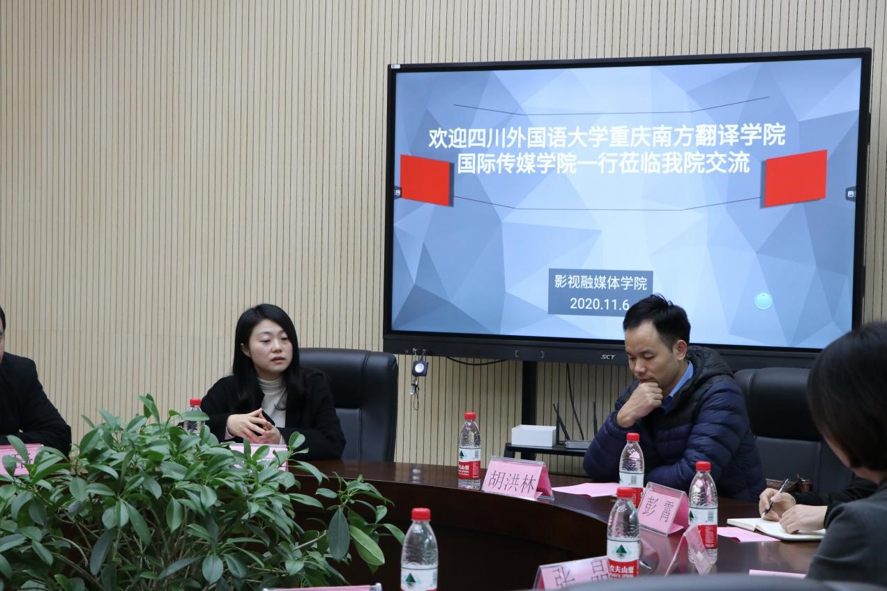 交流座谈会伊始,公司常务副经理王杨丽首先代表学院向到访的四川外国语大学重庆南方翻译学院国际传媒学院一行表示欢迎,并介绍了公司的基本情况,概述了关于公司专业发展方向、教学实践场所、与外企合作方式等方面,以及实现了产教真融真合的教学模式。