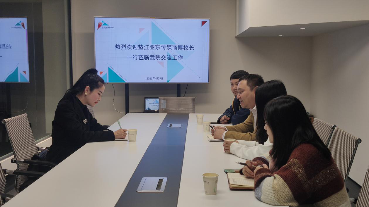 4月7日,重庆亚东传媒学校董事长商博一行到公司交流工作,学院常务副经理王杨丽、副经理张琦参加交流。