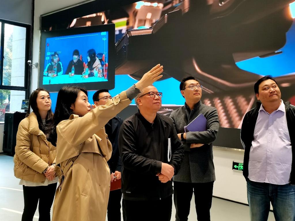 蒋满元副董事长一行在学院常务副经理王杨丽、党总支书记周倩、副经理张琦、办公室主任王玥极、团总支书记刘林森的陪同下,参观9103文化创意传播实训中心、9111V立方创作集群。