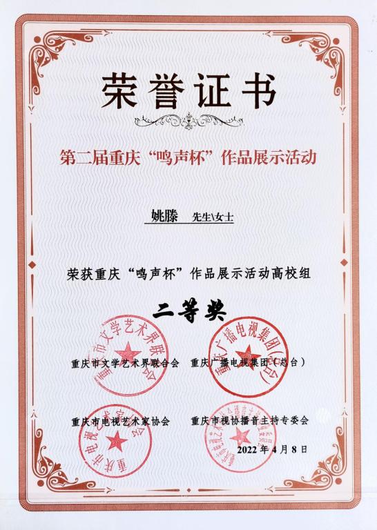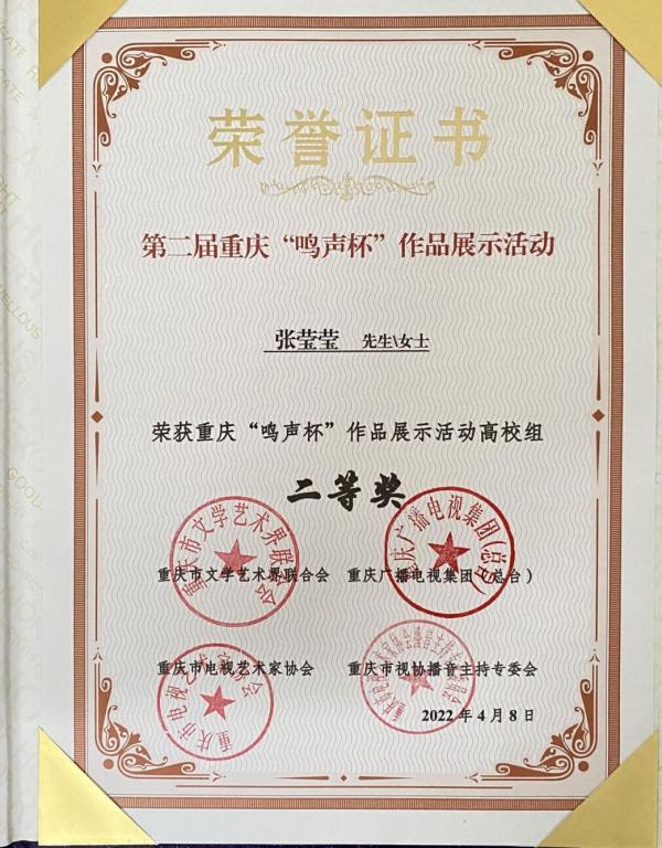 近日,由重庆市文学艺术界联合会、重庆广播电集团(总台)主办,重庆市电视艺术家协会、重庆广电集团播音主持专委会、重庆市视协播音主持专委会、重庆市视协高校专委会承办的重庆市第二届“鸣声杯”作品展示活动落下帷幕。公司播音与主持艺术专业张莹莹、姚滕老师报送的作品分别获得第二届重庆“鸣声杯”作品展示活动二等奖。
