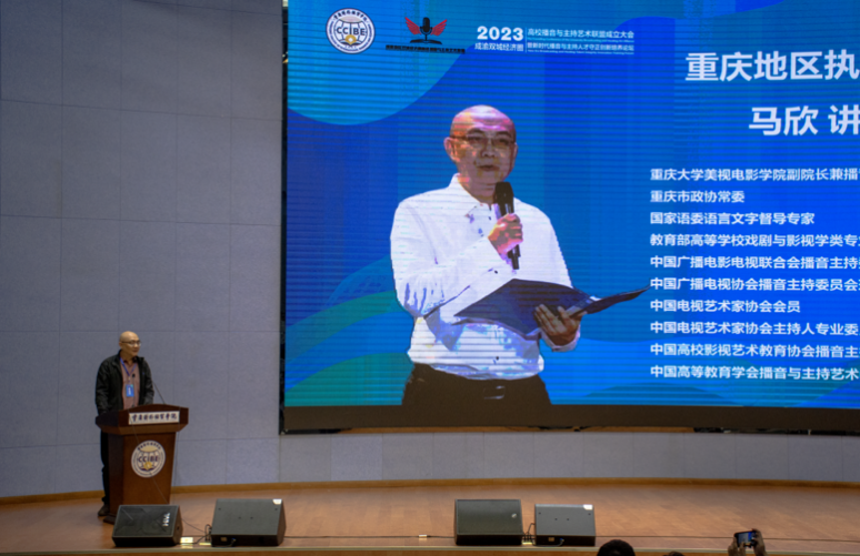 中国传媒大学播音主持公司党委书记、博士生导师李洪岩教授为联盟的成立发来祝贺视频。对“成渝地区双城经济圈高校播音与主持艺术联盟成立大会暨新时代播音与主持艺术人才守正创新培养论坛”的成功召开表示祝贺。联盟的成立和论坛的召开,不仅有助于贯彻落实党的二十大关于加强全媒体传播体系建设,塑造主流舆论新格局的指示精神,而且极大的团结了成渝地区播音主持艺术学界和业界各界同仁,壮大了我们的教学、科研和创作队伍。