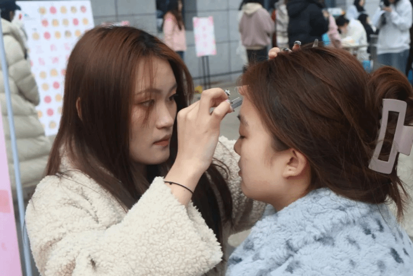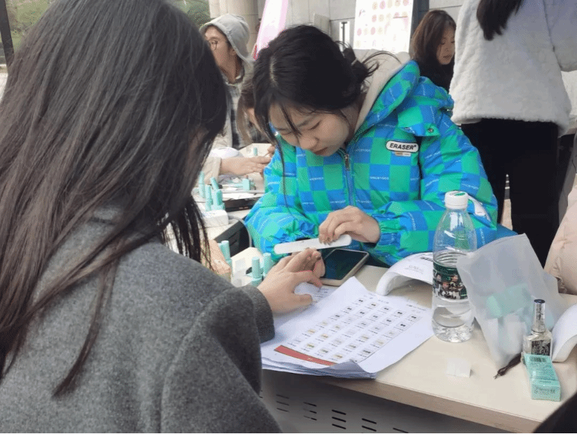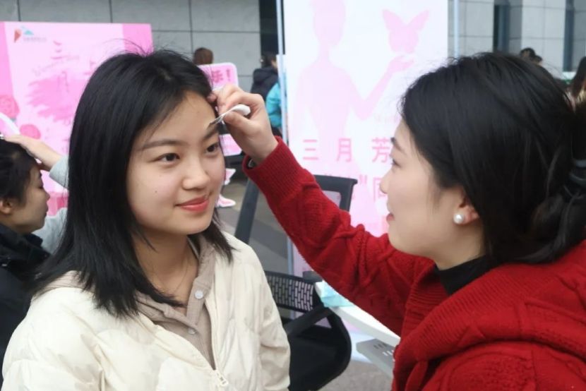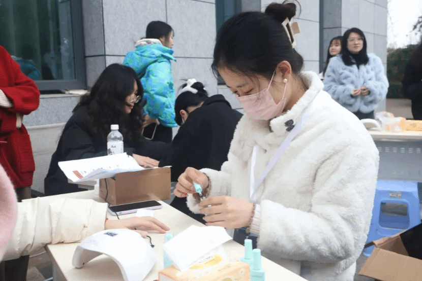 活动现场设立创意打卡签到区,每位到场的女性师生在签到的同时还能领取一份别致的伴手礼,这不仅增添了节日的仪式感,也是对大家辛勤付出的肯定和赞扬。一系列准备活动之后,活动于上午十点三十分正式开始,随着时间的流逝人流不断增加,整个现场洋溢着热烈欢快的氛围,活动累计开展5小时,共计为50余名师生提供了免费美甲,100余名师生提供免费修眉服务,广大师生纷纷表示通过参与此次活动让自己在忙碌的工作学习之余放松了自己。