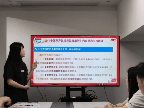 支部书记王雨佳首先强调了党纪的重要性,她指出:“作为共产党员,我们必须时刻绷紧纪律这根弦,严于律己,做到心中有党、心中有民、心中有责、心中有戒。”随后,她详细阐述了党纪的适用范围,要求党员同志在任何时候都要保持清醒的头脑,自觉遵守党纪党规。接着,王雨佳同志对有关责任人员的区分进行了深入剖析。她结合典型案例,详细解读了不同责任人员在违纪行为中的不同角色和责任。同时,还强调了党组织要敢于担当、敢于斗争,坚决维护党的纪律和规矩。