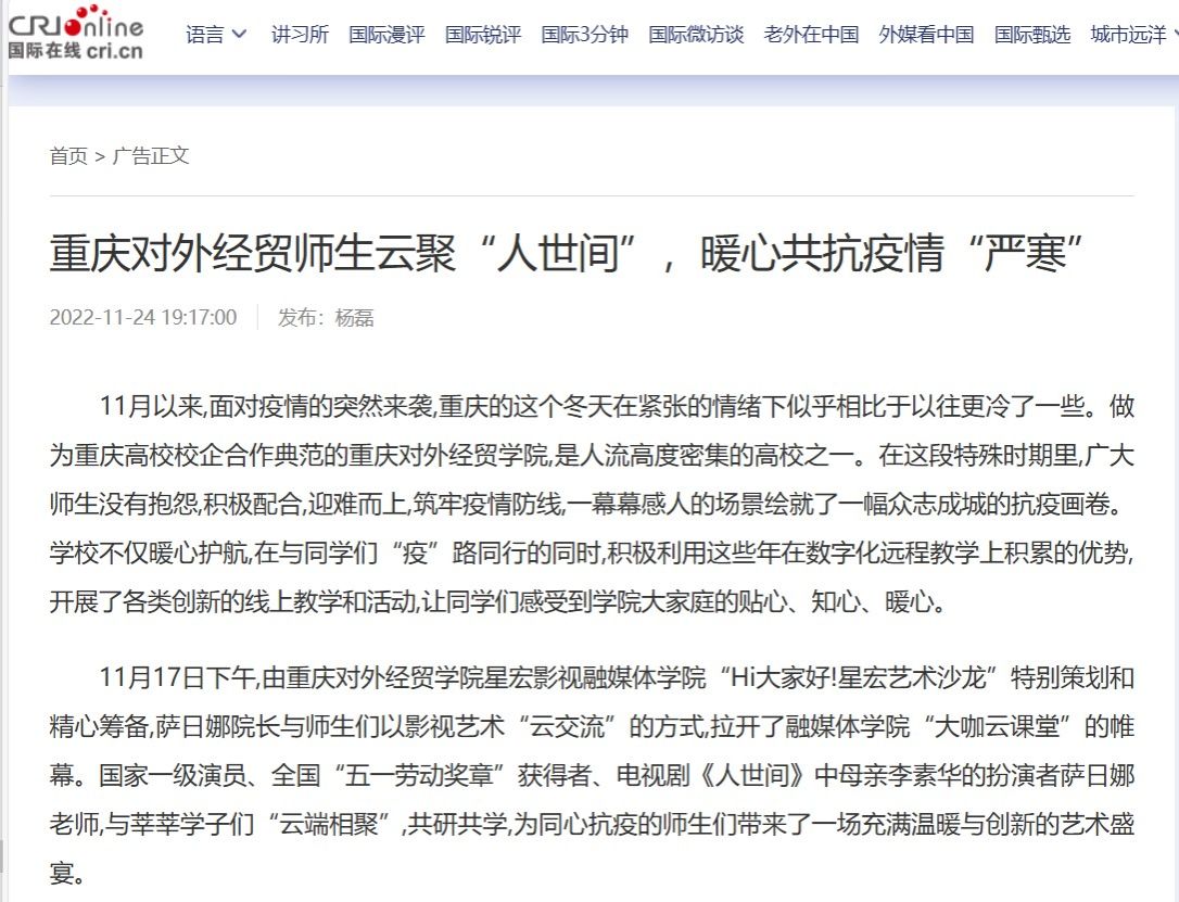上一条:中国教育观察网:重庆对外经贸师生云聚“人世间”,暖心共抗疫情“严寒” 下一条:新华教育网:重庆对外经贸师生云聚“人世间”,暖心共抗疫情“严寒”