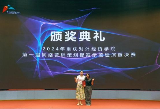 通过2个多小时的精彩提案与评委打分,由全体观众进行人气团队投票,比赛决出一等奖1个,二等奖3个,三等奖5个,人气奖1个,由李越霖老师、陈依彤老师、曾柯老师、孙文老师为获奖选手颁发奖项,并进行合影留念。其中,来自21级网络与新媒体本1班的吴飘同学以《亲爱的,大胆爱》这一作品获得比赛一等奖与人气奖。