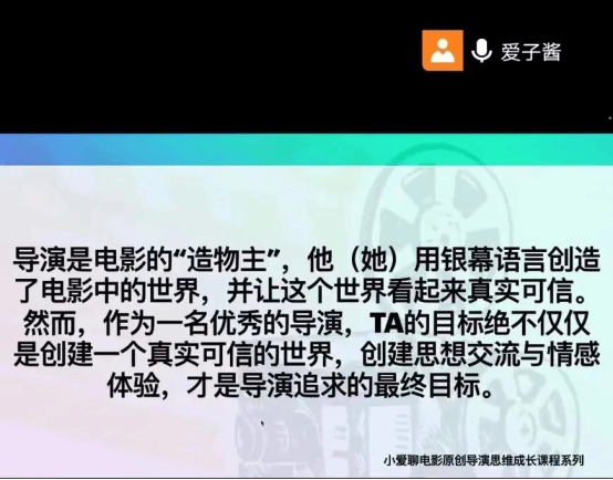 小爱导师结合电影案例和影视视频,详细生动地为同学们讲解了观众走进电影院是为了什么、导演为观众带来了什么、导演的本质是什么、电影的魅力是什么、导演是如何去创建一个真实的世界、导演在电影中运用到的手法和技巧、演员在电影中是通过什么去向观众表达情感的、导演的工作是什么。在课程的最后,小爱导师也建议同学们:要想成为好的电影工作者,需要多去观看好的电影作品,提高感知力。