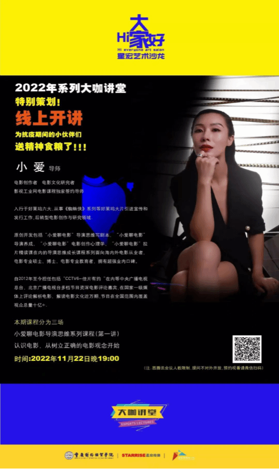 为了丰富同学们抗疫期间的精神生活,拓展同学们的专业知识,公海gh555000aa线路检测星宏公海gh555000aa线路检测特别策划“Hi,大家好!星宏艺术沙龙-2022大咖讲堂”线上开讲,本次线上大师课邀请到电影创作者、电影文化研究者、影视工业网电影课程独家签约导师小爱于2022年11月22日19:00为公司员工开展线上大咖讲堂。