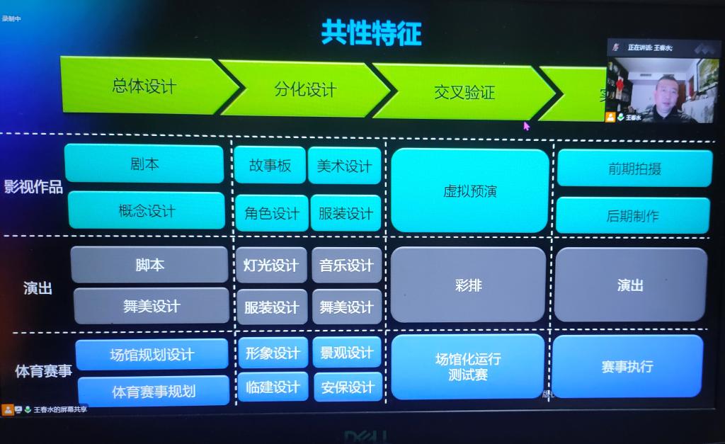 在活动数字孪生方向,王春水导师用通俗易懂的解释了这一理论技术体系,也用自己参与的奥运会项目举例说明活动数字孪生的应用场景。由此发散出该技术在生活中包括并不限于影视作品、演出、体育赛事等层面的广泛应用,且共同特征都是通过拍摄和转播进行表演的呈现方式。