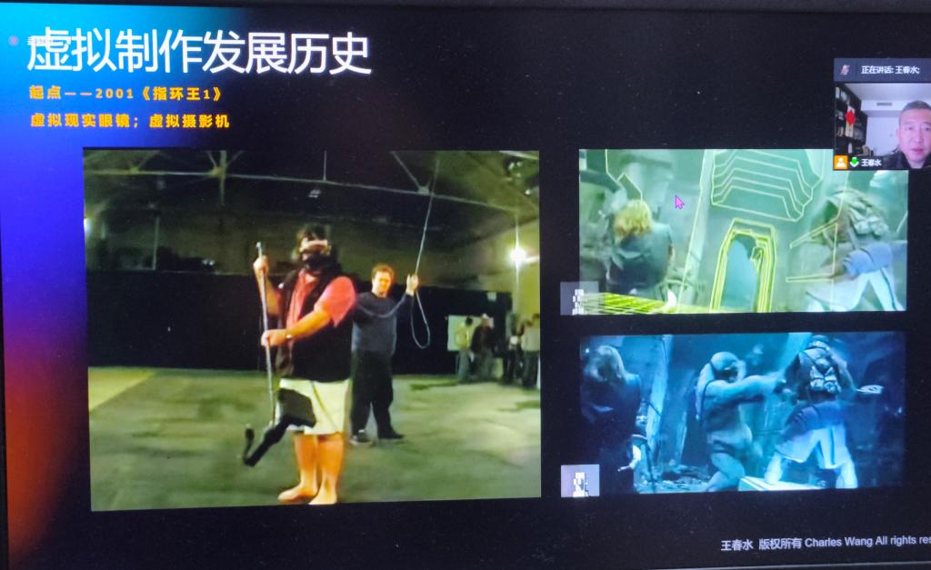 讲座开始,王春水导师非常专业的切入正题。先讲什么是虚拟制作?从虚拟制作的发展历史着手讲解,由2001年到2020年几部著名的科幻电影述说了特效制作并不拘于某一方面,尤其目前科技发展迅速。现阶段虚拟制作最大应用于动作捕捉、虚拟拍摄、游戏引擎。