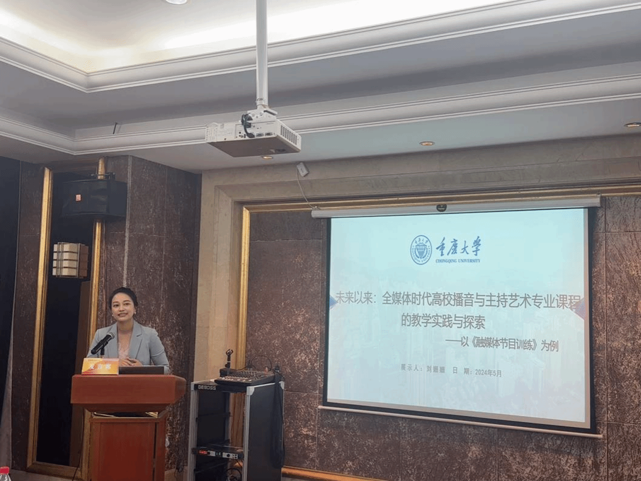 重庆大学美视电影学院播音专业骨干教师刘姗姗以课程《融媒体节目训练》为例进行了题为“未来已来:全媒体时代高校播音与主持艺术专业课程的教学实践与探索”的分享。她表示,面向新时代、新技术,播音主持艺术专业亟需围绕思政强体、文化铸魂、数字赋能三方面融合转型。