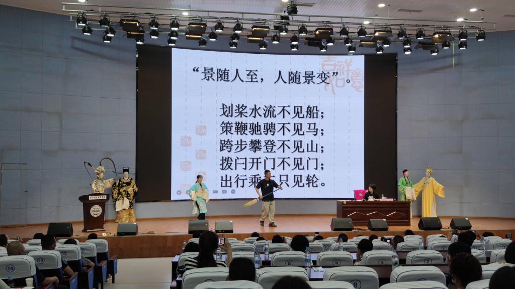 她在讲述川剧舞台表演的规范和音乐时,还为大家展示了相关的舞台表演。通过手势、步法、眼法等表演动作,区分出生旦净末丑物种戏曲行当。又与重庆川剧院青年演员们借助道具的使用,呈现出景随人至、人随景变的视觉补偿与想象的奇特效果,还有变脸、牵眼线、变胡子等各种奇思妙构的表现手法。