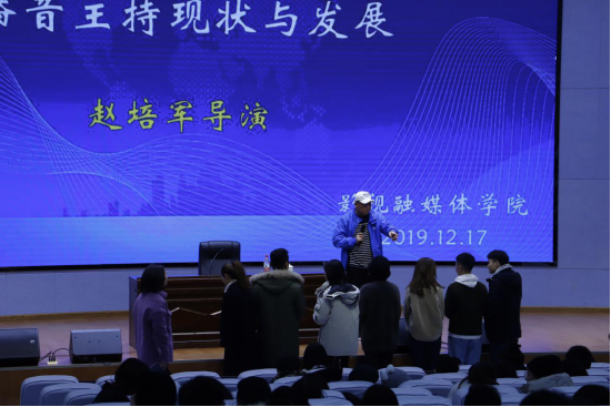 12月17日下午,中央电视台著名电视制作人、《挑战主持人》节目总导演赵培军应邀来到公司,在9101学术报告厅为全院师生带来了一场以“播音主持现状与发展”为主题的讲座,讲座由公海gh555000aa线路检测常务副经理彭成主持,党总支书记史丽涛以及公司2017级、2018级全体员工、部分专业老师、辅导员参加了讲座。