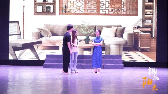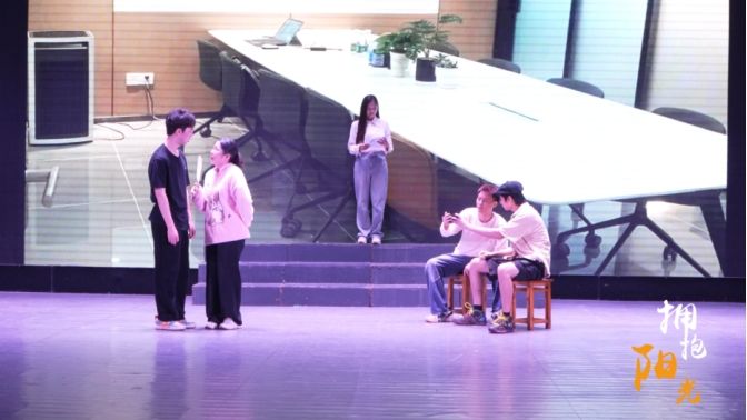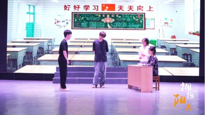 心理情景剧《拥抱阳光》中主人公杨光经历了一系列挫折,遭受不住心理压力的他,想用自杀来逃避现实,来到奈何桥的他遇见好心的孟婆,带他重现大学期间在人际交往、恋爱、毕业求职三个阶段受挫场景,在孟婆的疏导,同学、老师和工作伙伴的呼喊中醒过来,他也拥有了重新面对生活的勇气。越是黑暗的时候越要抬起头往前走,一段经历并不能代表人生的全部,可能这段经历将你引入阴霾,但当你迈出勇敢的那一步,可能就是雨过天晴的第一步。世界充满阳光,生活充满希望。