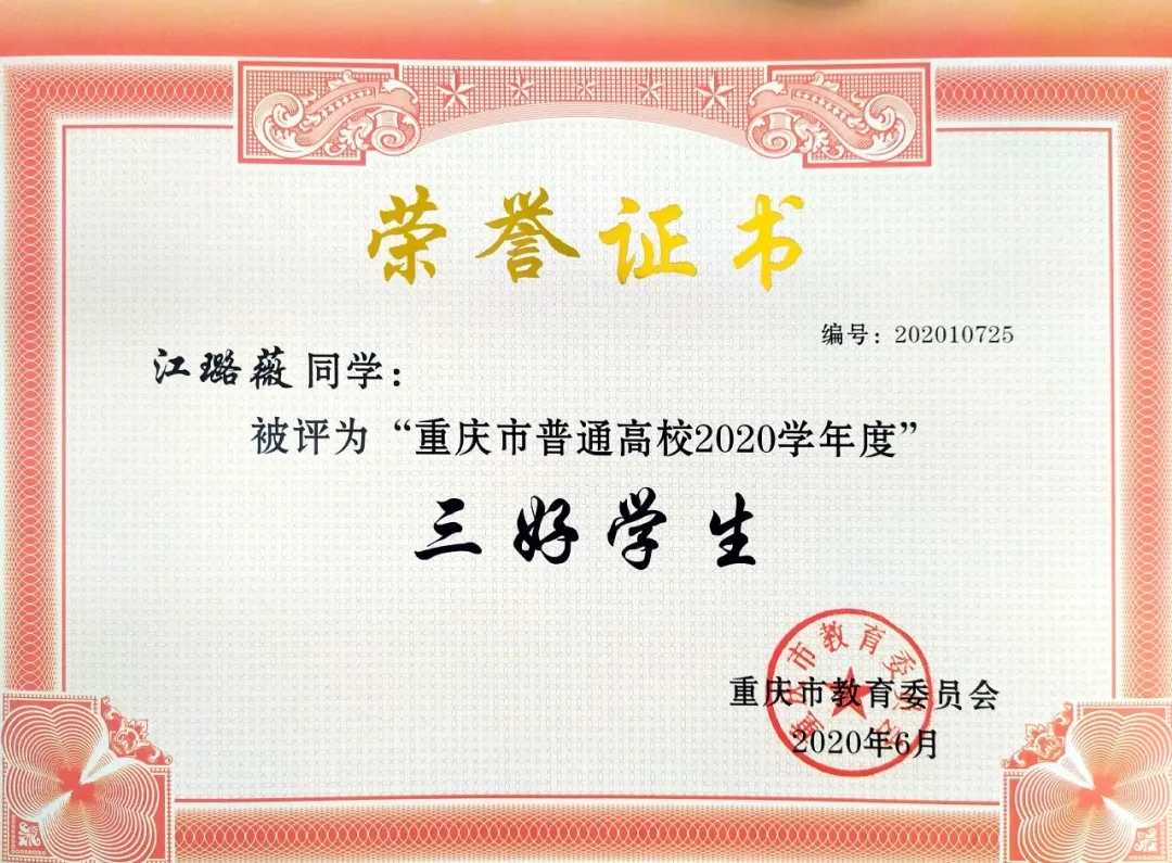 江璐薇曾是公司第一届优秀学子宣讲团骨干成员之一,积极为学校与学校、老师和同学们服务,也曾在大学身兼多职:节奏街头街舞社社长、院员工会副主席兼社团部部长、班长及辅导员助理等,积极参加校内校外各种活动,专业成绩在大学四年稳居年级第一,每学年获得国家励志奖学金、学习优秀奖一等奖学金等,曾获市级三好员工、校级“自立自强先进个人”、“优秀员工会干部”等称号。