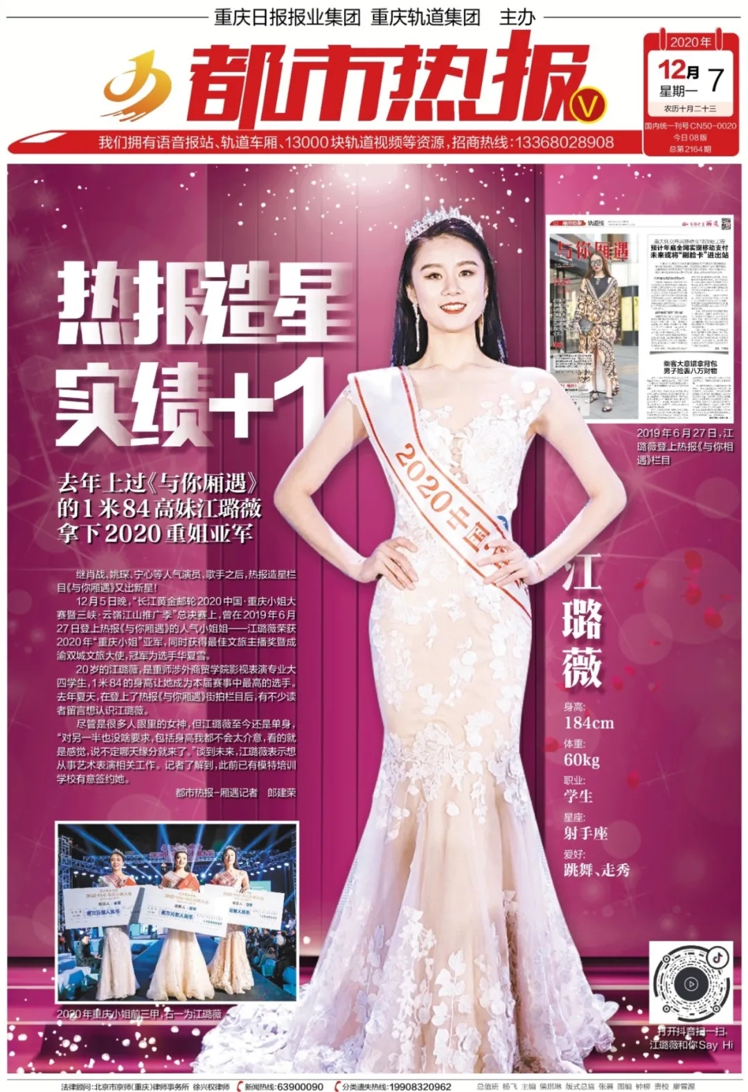 此外,在赛后江璐薇登上都市热报总第2164期封面。此前她已登上过热报《与你厢遇•街拍》两次版面,去年在北城天街街拍过她、这次总决赛莅临现场,第三次见到她的都市热报记者郎建荣表示:“时隔一年再次见到她,所变化实在让人惊艳!四个月减重30斤,带伤参加复赛,不仅长相漂亮,还学会各种舞蹈,唱跳走秀样样精通,英语还通过专业六级,不得不说是为多才多艺的重庆妹子。”