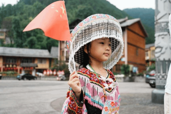 (图为苗族小女孩手拿国旗)