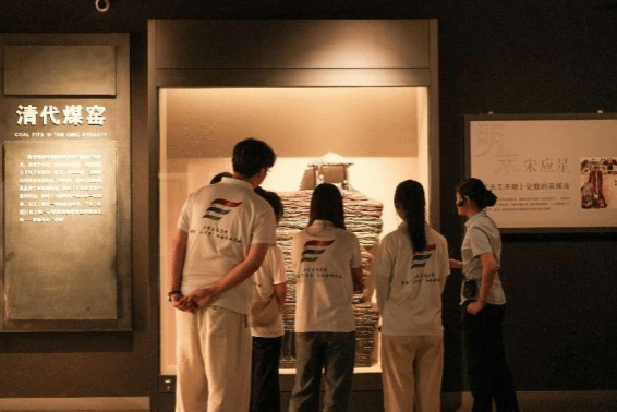 (图为实践团成员跟随讲解员观看清代煤窑模型)