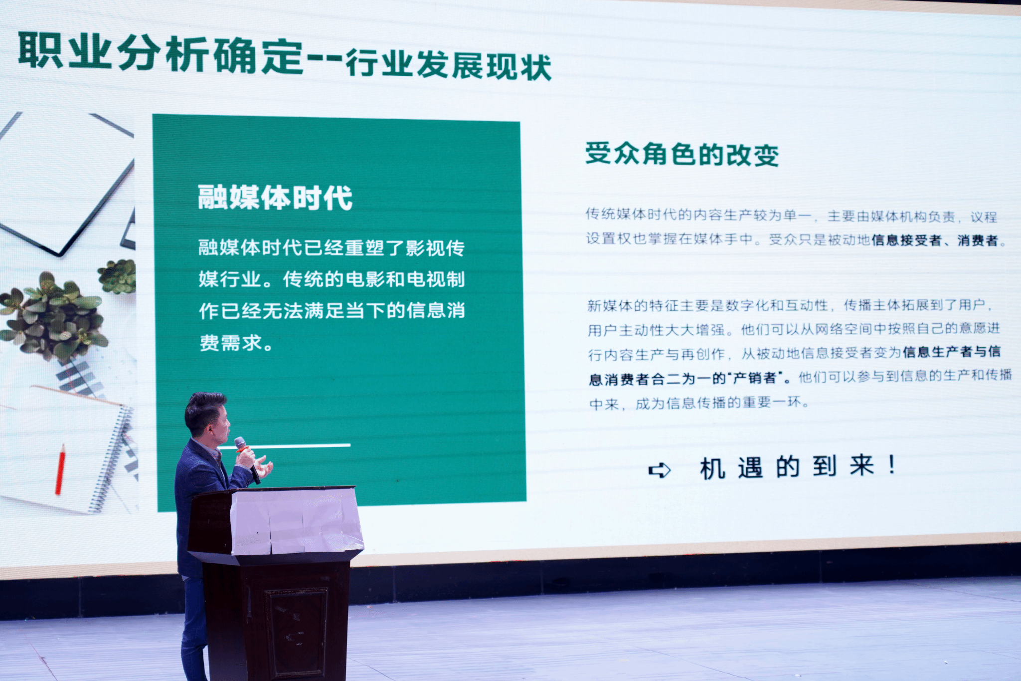在讲座中,陈老师指出,融媒体时代极大地改变了影视传媒行业的传播渠道和受众角色。行业的重塑既带来了新机遇,也提出了新的技能要求,应届毕业生在缺乏项目经验的情况下,要做好职业规划、岗位选择,首先要做的就是了解行业与岗位需求,努力做到人职匹配,然后再做短期和长远的职业规划。