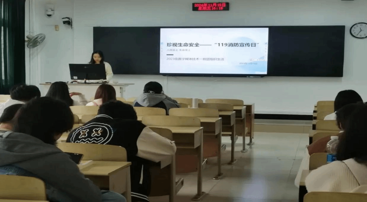 1992年,公安部发出通知,将每年的11月9日定为“119消防宣传日”。为构建和谐社会创造良好的消防安全环境,增强同学们的消防安全意识,2023级数字媒体技术1班全体成员于11月15日16:10在教室开展“珍视生命安全--人民至上 生命至上”团组织生活会。