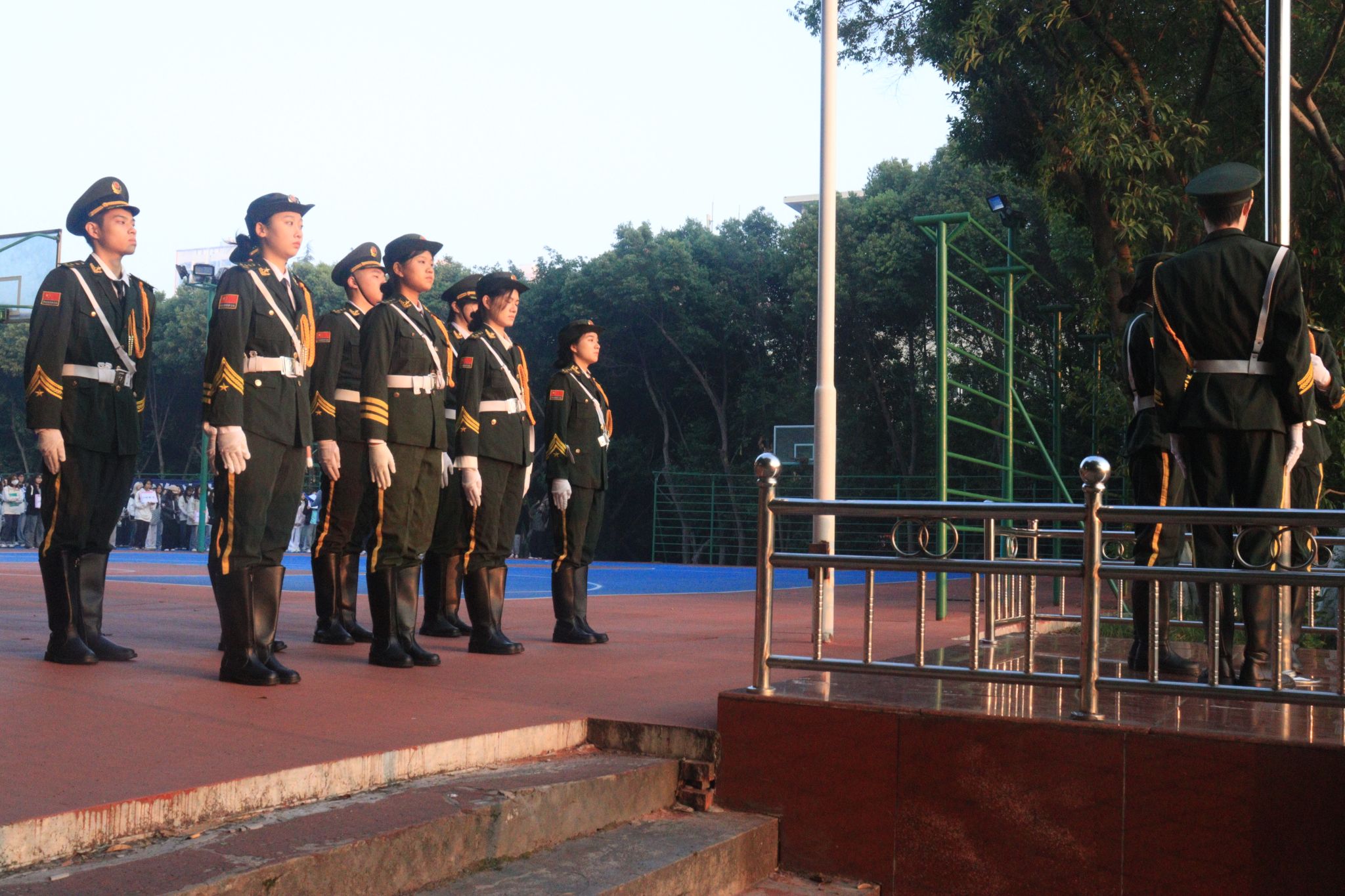 升国旗仪式现场,伴随着一声响亮的“出旗”,仪仗队以昂扬的身姿,迈着坚定有力的步伐,整齐划一地迈向升旗台。伴随着庄严的国歌,旗帜冉冉升起,迎风飘扬。