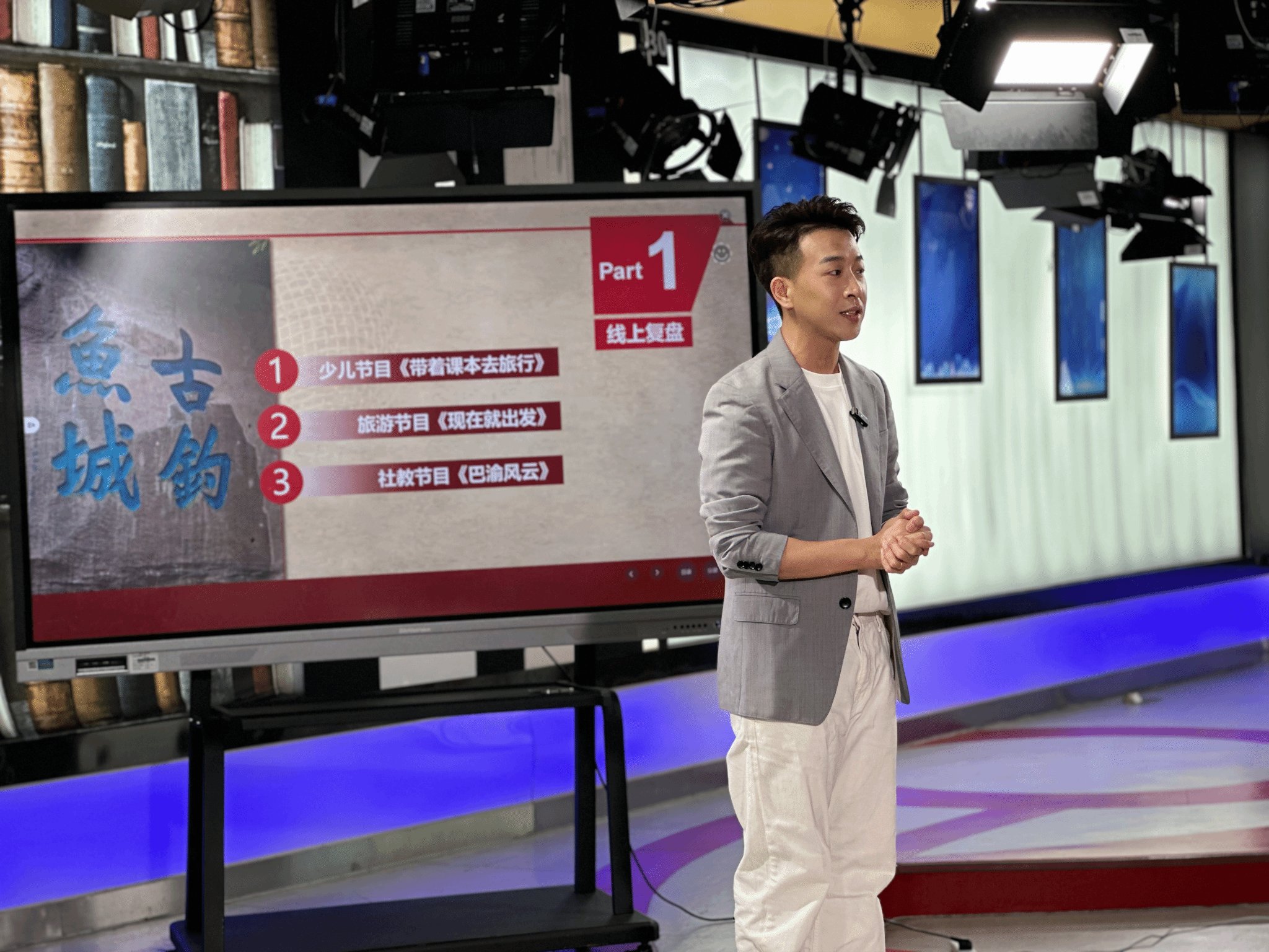 为了让同学们更好地将理论知识转化为实践能力,活动特别设置了线下实践展示环节。此次展示以钓鱼古城为实践对象,三组同学分别以不同的节目形式进行了精彩的呈现。第一组带来了充满童趣的少儿节目《带着课本去旅行》,两名女孩儿的展示生动活泼,对象感十足,仿佛将大家带入了一个充满奇幻色彩的童真世界;第二组的旅游节目《现在就出发》巧妙运用热梗“gogogo出发咯”,瞬间点燃了全场气氛,让大家感受到了旅行的魅力和活力;第三组的社教节目《巴渝风云》则以深厚的历史文化底蕴为依托,将钓鱼城的故事娓娓道来,引人入胜,使同学们在欣赏节目的同时,也对当地的历史文化有了更深入的了解。