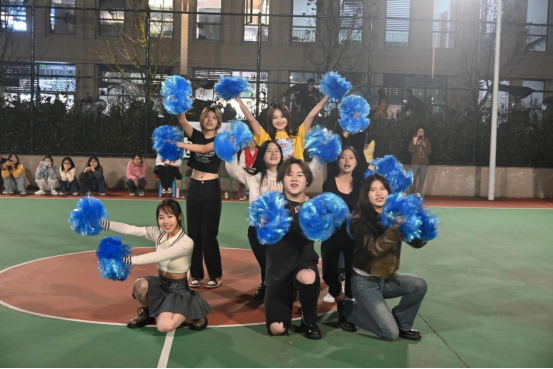 中场休息时球员们都在积极讨论和交流战术,对下半场的比赛进行更明确的战术计划以及团队配合、方位调整,突破上半场的薄弱点。场下的欢呼声从未停止,拉拉队伴随着激情昂扬的旋律闪亮登场,活力四射的展现出影融学子的热血青春与昂扬斗志,鼓舞着球员们,也激起了现场观众的热情。