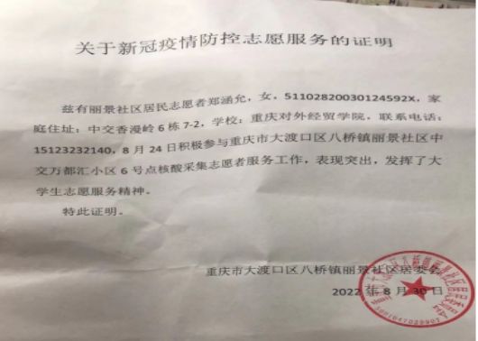 该生在暑假期间于重庆市长寿区参加了核酸检测现场的志愿服务。在长寿区突然有三例新增病例的背景下,长寿区举行了“三天三检”的核酸服务。该生秉持着为大家服务的思想,在此次志愿服务中负责录入核酸检测者的信息,为社区便利了服务,让整个核酸现场更加有条不紊。