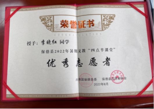 该生在暑假期间,参与了暑期义教志愿活动,主要为异地搬迁留守儿童进行假期作业辅导,重在普及知识,开发孩子们的智力,让孩子们感受到温暖的同时,增长知识、开阔视野、熏陶心灵,为孩子们提供更多德智体方面的关爱。