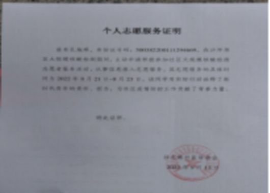 该生于2022年暑假期间参加社区志愿者服务。本次疫情期间,很荣幸能够作为志愿者为本次疫情贡献自己的一份力量,此次疫情的志愿工作主要是在小区门口及街道口执勤,对来往人员进行登记,并且测量体温,这次活动,让我了解到志愿者服务活动培养我的不仅仅是一种精神,更是培养了自己的极限和耐力,同时也看到自己的潜力。当我们奉献自己一份力量的时候,心里会觉得很幸福,觉得终于为社会做了一点力所能及的事情,在志愿活动中找到了自己的价值。