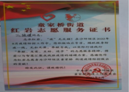 该生在大渡口区疫情防疫工作中,和小伙伴们一起参加到所属地区的社区志愿者活动中,帮助社区居民核酸检测的顺利开展,提供便民服务,为美好健康和谐的社区生活,添砖加瓦,积极响应无私奉献的精神。