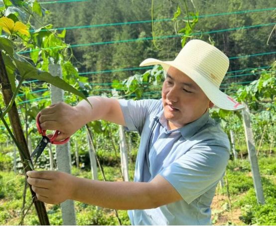 在与何财明聊天中我们了解到巫溪文峰是一个地势平坦、海拔适中、土壤肥沃的地方,何财明把鞋厂原料基地搬回了仅10公里外的老家——利民村。虽然是个新产业,但第一年试种的大丰收就让他尝到了甜头。都说丝瓜是个“懒庄稼”,对管护要求不高,在缺少劳力的农村来说,是个好产业。在支部书记的促成下,村里成立起了股份经济合作联合社,积极流转下来的土地也种下了络用丝瓜。村集体与何航鞋业签订了种植合同,会按丝瓜尺寸大小全部订单收购,丝瓜收益好带动务工价也涨到了200元一天,像这样在基地里务工的村民有20多个。
