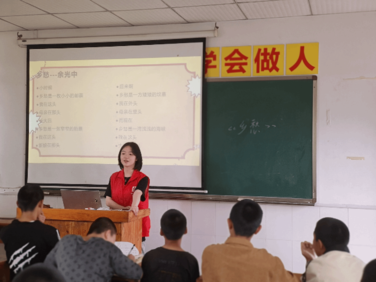 并且在中间,志愿者带领同学们学习《乡愁》,了解文章的作者、创作背景、思想情感,诗歌体现了诗人余光中期待中华民族早日统一的美好愿望,诗歌以时间的次序为经,以两地的距离为纬,在平铺直舒中自有一种动人心魄的魅力,引起人们无限的哀愁和无尽的相思。我们会慢慢的懂得乡愁是一本历史的巨著,它送给我们的不仅是沙漠甘泉,也给人间的旅人浇灌上心智的露水。寄愿乡愁伴随人类思想者的新生而在精神的坟冢中重新复苏,不要再让我们人类丢失为数不多的几亩梦田。