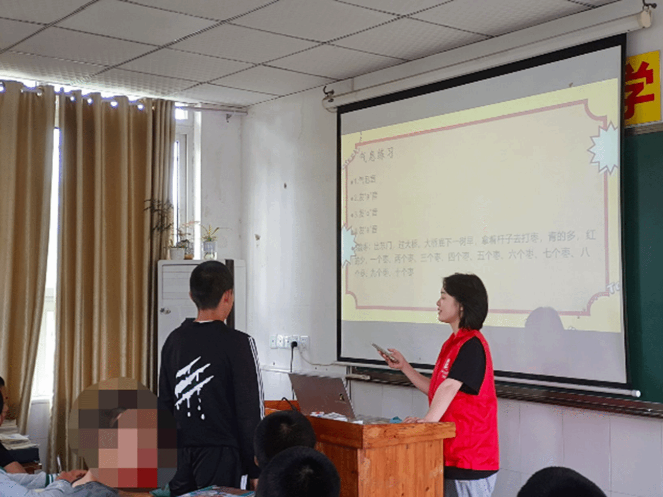 为了弘扬劳模精神,争做时代先锋,志愿者坚持做好对工读校的志愿服务,今天志愿者改变了以前的口部操练习,现在让同学们进行气息练习,通过一连串的词语,练习法“a”音,练习一口气数枣,来进一步提高他们的语言基础,同学们也是认真学习,积极举手,也更好的形成了学习氛围。