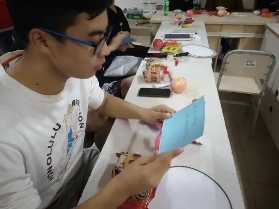 接下来的环节就是大家一起猜灯谜。当然,从古至今,猜灯谜都是有彩头的,猜对灯谜的同学可以获得一把无字白扇并写上对自己的祝福话语。当然每一个灯谜也都隐喻着美好的祝福,如十全十美的数字谜底“一”,一是万物初始,当我们踏入校园第一步,就组成了一个新的大家庭,有了一个新的开始,也希望我们一帆风顺,最后拥有一个美好的结果。