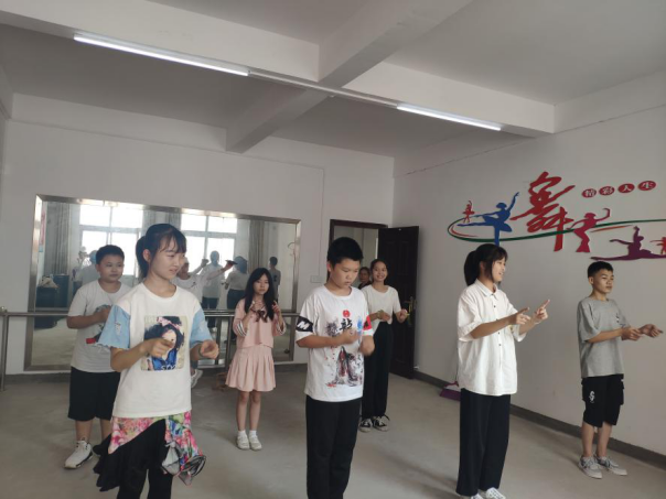 另一边志愿者们来到肖家社区服务点进行第二次文艺汇演的排练,对同学们进行手语操教学。