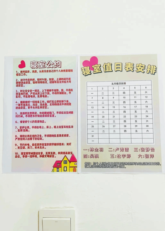 人创造环境,同时环境也影响人。宿舍成员在不违反住宿管理规定的前提下,积极对宿舍环境进行改造和美化,她们致力打造有特色、适宜学习、适宜生活的特色宿舍环境,比如张贴文化海报,制定学习目标表、寝室公约、寝室值日表等。