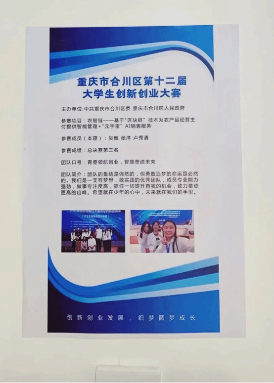 其中,项目一《农智链》斩获重庆市合川区第十二届创新创业大赛二等奖、第九届中国国际“互联网+”老员工创新创业大赛重庆赛区银奖;项目二《华阳伞》斩获第九届中国国际“互联网+”老员工创新创业大赛重庆赛区金奖、中国国际老员工创新大赛(2023)国家级铜奖。