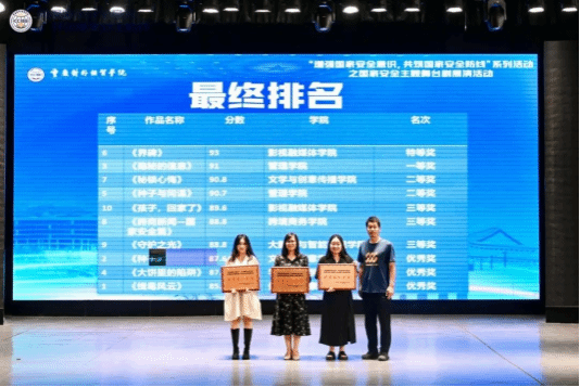 经过激烈的角逐,公司荣获“优秀组织单位”奖。公司作品《界碑》荣获特等奖;管理学院作品《隐秘的信息》荣获一等奖;文学与创意传播学院作品《秘锁心悔》、管理学院作品《种子与间谍》荣获二等奖;公司作品《孩子,回家了》、跨境商务学院作品《跨商新闻一国家安全篇》、大数据与智能工程学院《守护之光》荣获三等奖;文学与创意传播学院作品《种子》、学前教育学院作品《大饼里的陷阱》、体育与健康学院《缉毒风云》荣获优秀奖;黄媛馨、马静梅、夏梦被评为“优秀指导教师”。