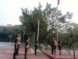 仪式第一项,由主持人宣布本次升旗仪式正式开始。国旗护卫队的同学们迈着矫健的步伐,伴着激昂的乐声,昂首阔步地来到升旗台。国歌奏响,全体肃立,行注目礼,国旗在歌声中缓缓升起。