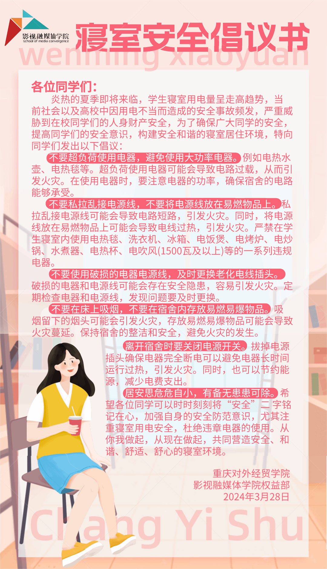 随后各班生活委员到各班级对应的寝室,根据寝室安全倡议书进行安全宣讲,并列举事例讲述寝室安全的重要性,并与各寝室同学共同将寝室安全倡议书张贴在寝室内的墙壁或门上。各寝室同学也主动配合工作,进行寝室安全自查,为守护寝室安全尽一份力。